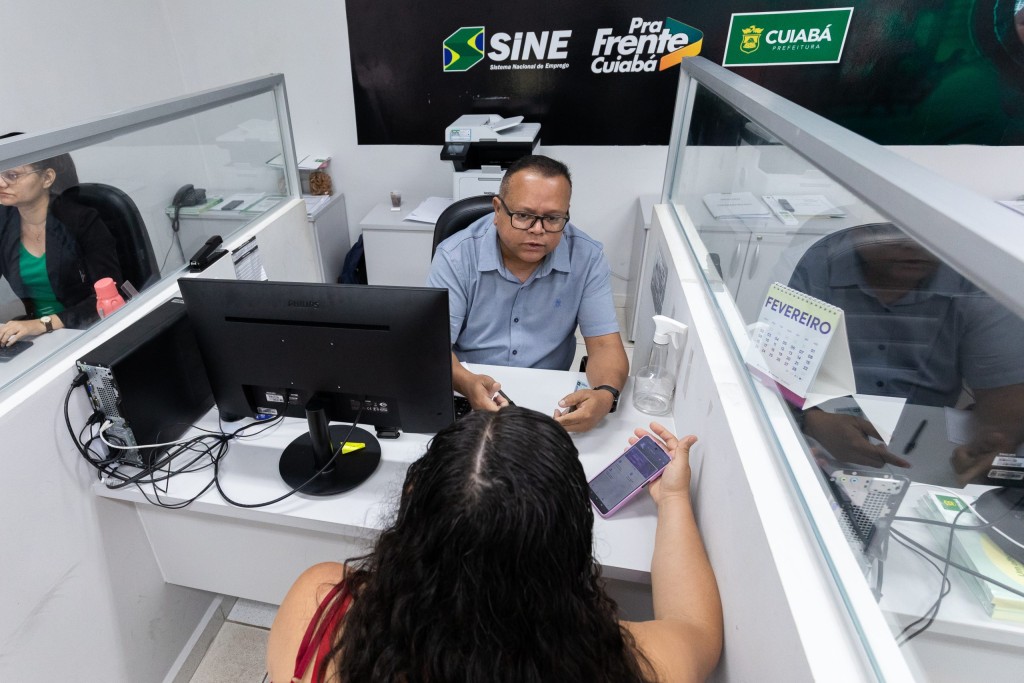 A imagem mostra um funcionário do Sine Municipal de Cuiabá auxiliando uma mulher no setor de atendimento ao público. A cena retrata um ambiente de trabalho com baias individuais.