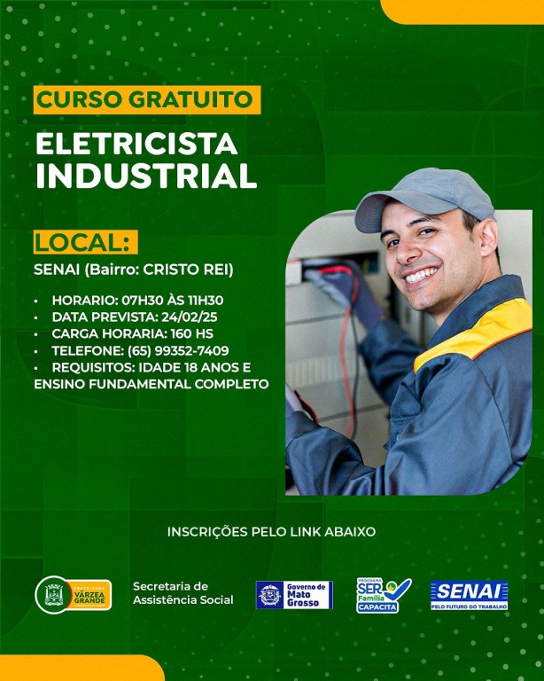 A prefeitura de Várzea Grande está ofertando cinco cursos gratuitos de qualificação profissional para a população. As oportunidades abrangem diferentes áreas e são voltadas para jovens e adultos que buscam capacitação para o mercado de trabalho. A oportunidade é fruto de uma parceria da secretaria de Assistência Social com o governo do Estado, através do programa SER Família Capacita, e com o Serviço Nacional de Aprendizagem Industrial (Senai).