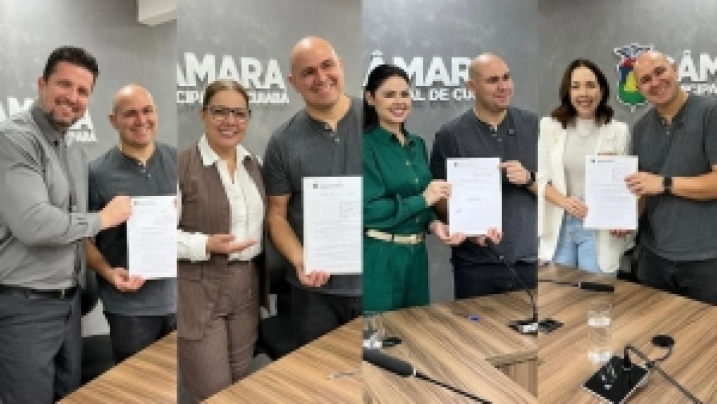 O prefeito Abilio Brunini (PL) sancionou, na tarde desta terça-feira (17), dez leis de autoria de vereadores da Câmara Municipal de Cuiabá. O ato aconteceu na sala das Comissões da Casa e contou com a presença dos parlamentares Rafael Ranalli (PL), Paula Calil (PL), Michelly Alencar (União Brasil) e Maysa Leão (Republicanos).